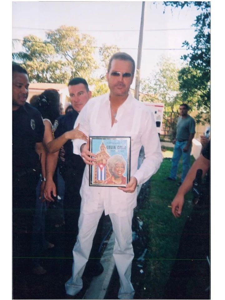 This photograph shows Oscar D' León posing with the famous “In Loving Memory of Celia Cruz” artwork. (Photo: Oscar Pelegrin)